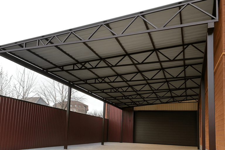 Чем больше площадь перекрытия, тем выше расход материалов и трудозатраты. Для небольших навесов можно использовать облегчённые решения, тогда как для больших потребуются усиленные опоры и фермы. -